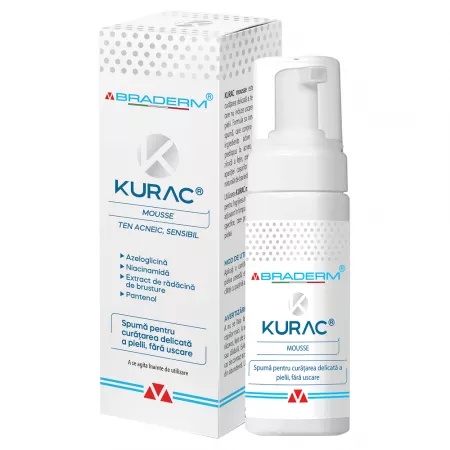 Spuma de curatare Kurac pentru ten acneic si sensibil, 100ml, Braderm Este o spuma antibacteriana pentru curatarea delicata a tenului gras, sensibil, care nu induce uscarea sau sensibilizarea pielii. Formula sa inovativa contine un complex special de ingrediente active specifice tenului predispus la acnee si permite curatarea zilnica a fetei, fiind ideala pentru utilizarea in timpul tratamentelor specifice antiacneice pe baza de retinoizi sau peroxid de benzoil. Mod de utilizare: Aplicati o cantitate mica de produs pe pielea umeda, efectuati un masaj usor si clatiti cu putina apa calduta. Ingrediente: Apa, Cocoamfoamdiacetat disodic, Esteri glicerici-8 de ulei de masline, Glutamat lauroil de sodiu, Potasiu azeloil diglicinat, Acid citric, Niacinamida, Sulfat de zinc, Inulina, Alfa-glucani oligozaharide, Extract de radacina de brusture, Ulei esential pur tangerine, Glicerina, Pantenol, Acetat de tocoferil, Cocamidopropil betaina, Sorbat de potasiu, Propilen glicol, Benzoat de sodiu, Tetrasodium glutamat diacetat, Clorura de sodiu, Poligliceril-3 cocoat, Poliglyceril-4 caprat, Poliglyceril-6 caprilat, Poliglyceril-6 ricinoleat, Ethylhexiglicerina, Phenoxiethanol, D-limonen, Linalool, Gama terpinem. Prezentare: 100ml