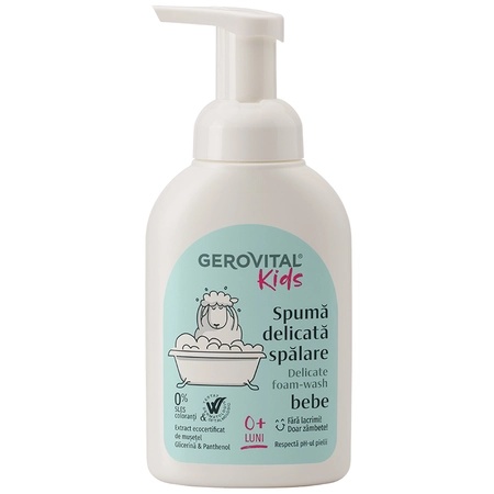 Spuma delicata pentru spalare bebelusi, 300ml, 7530, Gerovital Kids Pentru a asigura o îngrijire adecvată și blândă a bebelușului tău, este important să folosești produse speciale, precum spuma noastră delicată. Aceasta a fost creată cu grijă pentru a respecta nevoile pielii delicate a bebelușului tău, având în componență ingrediente naturale și benefice. Caracteristici: Extract ecocertificat de mușețel: Oferă efecte calmante și protectoare pentru pielea bebelușului. Glicerină și Panthenol: Ingrediente cu proprietăți hidratante, menite să mențină pielea catifelată și hidratată. Respectă pH-ul pielii: Formula special concepută respectă echilibrul natural al pielii bebelușului. Fără coloranți: Nu conține coloranți artificiali pentru a minimiza riscul de iritații. Fără SLES: Produsul nu conține Sodium Lauryl Ether Sulfate, un ingredient agresiv pentru piele. Testat dermatologic: Produsul a fost supus testelor dermatologice pentru a asigura siguranța și toleranța ridicată pe pielea sensibilă a bebelușului. Testat oftalmologic: Produsul a fost testat oftalmologic pentru a se asigura că nu irită ochii sensibili ai bebelușului. Mod de utilizare: Umezii părul și corpul bebelușului. Aplică o cantitate adecvată de loțiune pe părul și corpul umed al bebelușului. Masează ușor cu mișcări circulare pentru a crea o spumă delicată. Clătește bine cu apă călduță pentru a îndepărta complet produsul. După utilizare, se va simți un parfum delicat de curățenie și prospețime. Precauții: Pentru siguranța bebelușului, asigură-te că produsul este păstrat într-un loc inaccesibil copiilor. Ingrediente: Aqua, Glycerin, Sodium Cocoamphoacetate, PEG-40 Hydrogenated Castor Oil, Capryloyl/Caproyl Methyl Glucamide, PEG-6 Caprylic/Capric Glycerides, Lauroyl/Myristoyl Methyl Glucamide, Cocamidopropyl Betaine, Sodium Chloride, Panthenol, Sodium Benzoate, Polyquaternium-44, Parfum, Citric Acid, Chamomilla Recutita Flower Extract, Potassium Sorbate, Phenoxyethanol, Ehylhexylglycerin, Disodium EDTA. Prezentare: 300ml