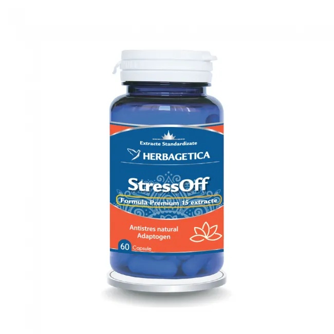 StressOff, 60 capsule, Herbagetica StressOff conține 15 extracte premium care acționează ca antistres natural și scad nivelul de cortizol, hormonul stresului, datorită efectelor adaptogene. Extractele de Rhodiola, Ashwagandha, Tulsi, Ginseng Siberian, Centella asiatica, Bacopa monnieri, Jatamasi, Amla, Shatavari, Arjuna, Giloy, Coama-leului, Convolvulus Pluricaulis scad nivelul de cortizol și reduc astfel stresul cronic. Actiuni: Crește adaptarea organismul la stres, Reduce stările de oboseală, Crește performanța cognitivă, Reface echilibrul psiho-emoțional, Tonic pentru sistemul nervos, Prote