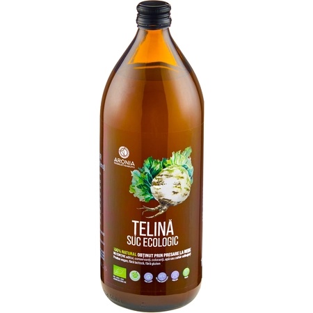 Suc ecologic de Țelină 1L, obținut prin presare la rece din rădăcini proaspete, 100% natural, fără aditivi, conservanți sau zahăr adăugat. Poate fi integrat cu ușurință într-o alimentație echilibrată, oferind un plus de nutrienți și hidratare. Proprietăți: Realizat exclusiv din Țelină provenită din culturi ecologice Presare la rece, menținând calitățile naturale ale legumei Nu conține apă, arome, coloranți sau conservanți Potrivit pentru diete vegane, fără lactoză și fără gluten Mod de consum: Se recomandă 50-100 ml pe zi, consumat ca atare sau diluat. Agitați sticla înainte de fiecare utilizare. A nu se depăși doza zilnică recomandată. Suplimentele alimentare nu înlocuiesc o dietă variată și un stil de viață sănătos. Precauții și contraindicații: Nu este recomandat copiilor mici, femeilor însărcinate sau celor care alăptează. A se păstra la loc uscat și răcoros, ferit de lumina directă a soarelui. Informații nutriționale: Valori medii per 100ml: Valoare energetică: 99 kJ / 23 kcal Proteine: 1,1 g Glucide: 4,4 g (din care zaharuri naturale: 1,8 g) Grăsimi: 0 g (din care grăsimi saturate: 0 g) Sare: 0,19 g Ingrediente: 100% suc pur ecologic de Țelină Prezentare: 1 litru