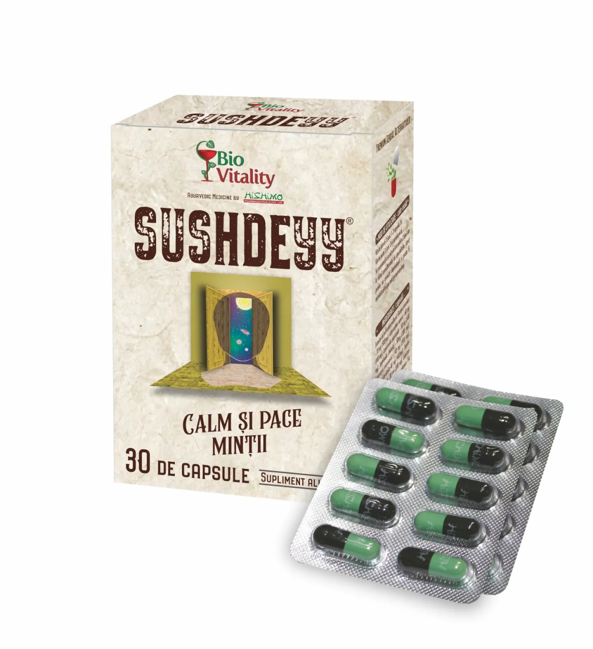 Sushdeyy Calm si pace mintii, 30 capsule, Bio Vitality Sushdeyy este o formula de referinta in medicina ayurvedica, ce combina extracte si pulberi naturale din plante, cu proprietati de detensionare si relaxare musculara, antispasmodice, anticonvulsive, antiamnezice si antistres. Sushdeyy contribuie la: Ameliorarea durerilor și rigidității musculare apărute din cauza stresului sau menținerii la birou a unei poziții timp îndelungat (cum ar fi senzația “gâtului înțepenit” sau rigiditate cervicală); Atenuarea contracțiilor bruște sau involuntare; Reducerea exceselor comportamentale specifice copi
