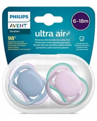 Suzete Ultra Air Albastru/Mov, 6-18 luni, 2 bucati, SCF085/34, Avent