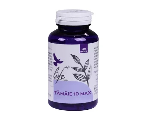 Tamaie 10 Max, 60 capsule, Bionovativ Proprietati: Susține funcția mentală; menține colesterolul din sânge în limite normale; susține funcția inimii; susține sănătatea tractului gastro-intestinal; menține mucoasa sistemului digestiv; contribuie la flexibilitatea articulațiilor; susține sănătatea plămânilor; susține sănătatea menstruală; susține sănătatea sexuală a bărbaților. Mod de folosire: Câte 1-2 capsule, de 2 ori pe zi. Precautii: A se consuma cu prudență de către copii și femei însărcinate sau care alăptează. Poate interacționa cu anticoagulantele la administrare concomitentă. Contraindicat persoanelor cu boli autoimune. Ingrediente: Extract 5-10:1 din rășină de Arbore-de-tămâie (Boswellia serrata), cu min 20% acizi boswellici: 134 mg; extract hidroetanolic 12-15:1 (maltodextrină) din rășină de Arbore-de-tămâie (Boswellia serrata), cu min 30% acizi boswelici: 130 mg; pulbere din rășină de Arbore-de-tămâie (Boswellia serrata): 132,8 mg; capsulă vegetală din orez; ulei esențial de Arbore-de-Tămâie–sacră (Boswellia sacra): 0,1 mg; ulei esențial de Arbore-de-Tămâie (Boswellia serrata): 0,1 mg. Prezentare: 60 capsule.