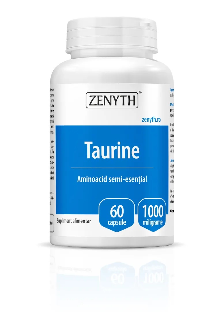 Taurine, 1000mg, 60 capsule, Zenyth Taurina este un aminoacid semi-esential, cu un puternic efect antioxidant, ce protejeaza creierul, inima, ochii si celulele saguine. Aminoacizii semi-esentiali sunt aceia care pot fi sintetizati in organismul uman doar in prezenta unor aminoazici esentiali. Actiune: Mentine sanatatea sistemului cardiovascular. Contribuie la mentinerea nivelului de colesterol si de trigliceride. Protejeaza ficatul si intregul organism de efectul nociv al toxinelor si metalelor grele. Scade nivelul glicemiei si rezistenta organismului la insulina. Sustine digestia si absorbtia