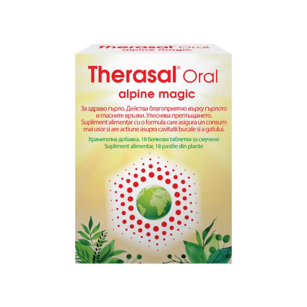Therasal Oral Alpine cu gust mentolat, 18 comprimate de supt, Vedra Supliment alimentar cu o formula care asigura un consum mai usor si poate avea actiune asupra cavitatii bucale si a gatului. Vitamina E si C pot contribui la protejarea celulelor impotriva stresului oxidativ. Vitamina C poate contribui la functionarea normala a sistemului imunitar. Are gust mentolat. Mod de administrare: Adulti: zilnic, se suge cate 1 pastila la fiecare 2-3 ore, fara a se depasi 6 pastile. Doza zilnica recomandata poate varia in functie de necesitati si se poate modifica doar la sfatul consultantului de specialitate. Precautii: A se pastra in ambalajul original, la temperatura camerei, in locuri ferite de umiditate si de lumina directa a soarelui. Ingrediente: Pe pastila pentru supt: zahar; agent de incarcare: glucoza, unt (grasime animala), acid acsorbic/ vitamina C, grasime de pasare, potentiator de aroma: aroma alpine magic si mentol cristale (emulsifiant: ulei neutru), extract din fructe de Mar (Pyrus malus), acetat de D-alfa tocoferol/ vitamina E, extract din frunze de Praz (Allium porrum), colorant: (clorofila). Prezentare: 18 comprimate de supt