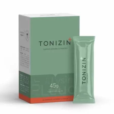 Tonizin, 15 plicuri, Naturpharma Tonizin este un supliment alimentar cu aminoacizi esențiali, nucleotide, vitamina C, vitamina D și minerale (Magneziu, Zinc). Mod de utilizare: 1 plic pe zi. Conținutul plicului se dizolvă într-un pahar cu 200 ml apă, se amestecă energic, iar suspensia rezultată se consumă imediat. Precautii: A nu se consuma de către femeile însărcinate sau care alăptează, precum și de către persoanele cu hipersensibilitate la oricare dintre componentele produsului. A nu se consuma de către persoanele cu fenilcetonurie. Produsul conține fenilalanina. A nu se depăși doza recomandată pentru consumul zilnic. Suplimentele alimentare nu înlocuiesc o dietă variată și echilibrată și un mod de viață sănătos. A nu se lăsa la îndemâna și la vederea copiilor mici. Ingrediente active: Agent de încărcare: trehaloză; L-leucină; săruri de magneziu ale acidului citric/ citrat de magneziu, furnizând 15,45% magneziu; L-izoleucină; L-valină; L-lizină; L-treonină; L-histidină; L-fenilalanină; L-metionină; L-triptofan; acid L-ascorbic/ vitamina C; potențiatori de aromă: căpșuni (maltodextrină, amidon modificat, triacetat de glicerol, propilenglicol), bitter (sucraloză, maltodextrină); uridină monofosfat; picolinat de zinc, furnizând 21,5% zinc; inozin monofosfat; agent antiaglomerant: dioxid de siliciu; acidifiant: acid citric; suc concentrat de Sfeclă-roșie/ Beta vulgaris (maltodextrină, acid citric); colecalciferol (maltodextrină din porumb)/ 0,25% vitamina D; îndulcitori: sucraloză, steviolglicozide din extract de Stevia rebaudiana. Prezentare: 15 plicuri