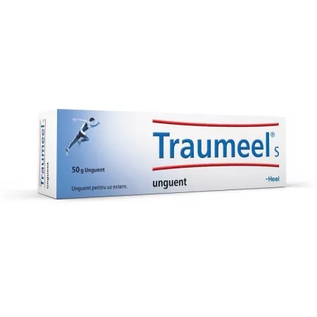 – folosește puterea sinergică a 14 ingrediente naturale, ajuta la remiterea inflamației, la îmbunătățirea vindecării naturale, precum și in procesele de regenerare a țesuturilor; – este un medicament cu rol in ameliorarea simptomelor inflamatorii si dureroase din luxaţii şi alte traumatisme ale aparatului locomotor, ajută la o recuperare rapidă postraumatică. Ingrediente : Per 100 g unguent: Achillea millefolium TM 0,090 Aconitum napellus D1 0,050 Arnica montana D3 1,500 Atropa belladonna D1 0,050 Bellis perennis TM 0,100 Calendula officinalis TM 0,450 Echinacea TM 0,150 Echinacea purpurea TM 0,150 Hamamelis virginiana TM 0,450 Hepar sulfuris D6 0,025 Hypericum perforatum D6 0,090 Matricaria recutita TM 0,150 Mercurius solubilis Hahnemanni D6 0,040 Symphytum officinale D4 0,100 Excipienti: parafina lichida, alcool cetostearilic, emulsificat tip A, parafina alba usoara, apa purificata, etanol 96% acc. etanol 94% Mod de administrare: Utilizaţi întotdeauna acest medicament exact aşa cum este descris în acest prospect sau aşa cum v-a spus medicul dumneavoastră sau farmacistul. Discutaţi cu medicul sau cu farmacistul dacă nu sunteţi sigur. Doza uzuală este: Adulţi şi Masaţi uşor aproximativ 1,5 cm de unguent pe suprafaţa afectată, copii de 3 ori pe zi sau mai des Contraindicații: Nu utilizaţi Traumeel S unguent -dacă sunteţi alergic (hipersensibil) la oricare dintre componentele active, la Echinacea sau la alte plante din familia Asteracee sau la oricare dintre celelalte componente ale acestui medicament. Precautii: Înainte să utilizaţi Traumeel S unguent, adresaţi-vămedicului dumneavoastră sau farmacistului. Acţiunea unui medicament homeopat poate fi influenţată negativ de unii factori de mediu, de stilul de viaţă inadecvat, de o dietă bogată sau de consumul de etanol, tutun, stimulante. Traumeel S unguent împreună cu alte medicamente Spuneţi medicului dumneavoastră sau farmacistului dacă utilizaţi, aţi utilizat recent sau s-ar putea să utilizaţi orice alte medicamente. Nu se cunoaşte ca Traumeel S să influenţeze alte medicamente sau alte medicamente să influenţeze Traumeel S. Traumeel S unguent împreună cu alimente, băuturi şi alcool Acţiunea unui medicament homeopat poate fi influenţată negativ de unii factori de mediu, de stilul de viaţă inadecvat, de o dietă bogată sau de consumul de etanol, tutun, stimulante. Sarcina, alăptarea şi fertilitatea: Dacă sunteţi gravidă sau alăptaţi, credeţi că aţi putea fi gravidă sau intenţionaţi să rămâneţi gravidă, adresaţi-vă medicului sau farmacistului pentru recomandări înainte de a lua acest medicament. Pentru acest medicament nu există studii clinice referitoare la efectele în timpul sarcinii şi alăptării. De aceea nu trebuie utilizat în timpul sarcinii sau alăptării. Conducerea vehiculelor şi folosirea utilajelor: Traumeel S unguent nu influenţează capacitatea de a conduce vehicule şi de a folosi utilaje. Prezentare: 50g Atentionare: Citiţi cu atenţie şi în întregime prospectul înainte de a începe să utilizaţi acest medicament, deoarece conţine informaţii importante pentru dumneavoastră.