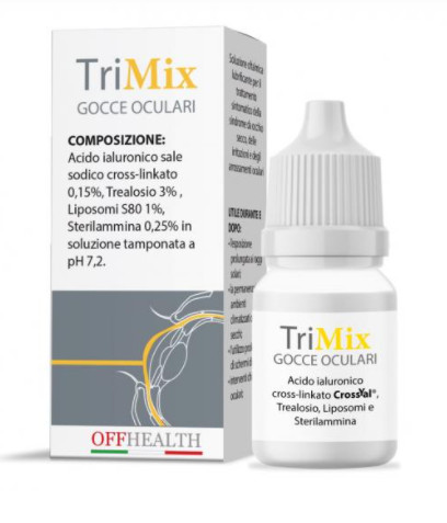 TriMix picaturi oftalmice, 8ml, OffHealth Descriere: TriMIX este o solutie oftalmica de protectie, hidratare si lubrifiere pe baza de sare sodica a acidului hialuronic cross-linkat, trehaloza si stearilamina in lipozomi, formulata pentru a restabili proprietatile fiziologice ale suprafetei oculare. Combinatia de acid hialuronic cross-linkat si trehaloza confera produsului o viscoelasticitate ridic
