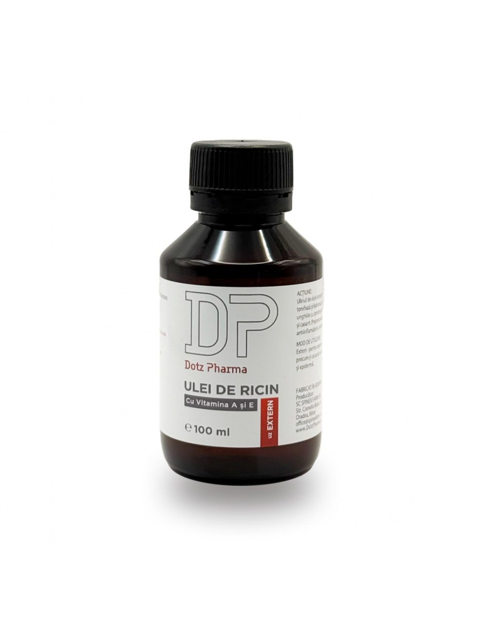 Ulei de ricin cu vitamina A si E, 100 ml, Dotz Pharma Uleiul de ricin Dotz Pharma este un produs natural bogat in acizi grasi si vitamine esentiale, cu efecte benefice pentru piele, par si unghii. Formulat cu vitamina A si vitamina E, sustine regenerarea si protejarea tesuturilor, oferind hidratare si nutritie in profunzime. Beneficii: Hidrateaza intens pielea uscata si sensibila Regenereaza si in