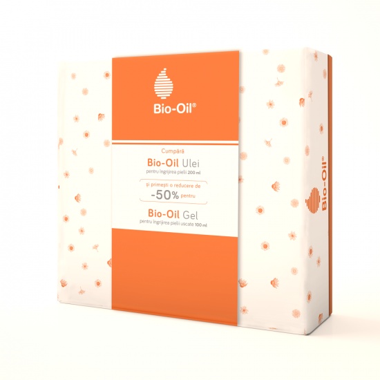 Pachet Ulei pentru ingrijirea pielii, 200 ml + 50% reducere la Gel pentru îngrijirea pielii uscate, 100 ml, Bio Oil Bio-Oil® Gel pentru îngrijirea pielii uscate Bio-Oil® Gel pentru îngrijirea pielii uscate este un produs nou, care reface bariera protectoare a pielii și hidratează în profunzime. Formularea de gel cu o cantitate mare de ulei permite o absorbție ușoară și creează un film protector care împiedică pierderea de apă, restabilând astfel gradul optim de hidratare. Îngrijirea pielii, acum realizată cu o formulă care combină ingrediente multiple, cu doar 3% apă Noul produs Bio-Oil® Gel pentru îngrijirea pielii uscate îmbină emolienți (cum ar fi untul de shea) și umectanți (precum glicerină și uree), împreună cu ingrediente cu efect calmant pentru piele (cum ar fi niacinamida, o vitamină din grupul de vitamine B), pentru a crește hidratarea pielii. Ingrediente: Glicerină – mărește hidratarea Unt de shea – hrănește și hidratează Niacinamida – ajută la protejarea barierei naturale a pielii Uree – netezește și catifelează Mușețel – calmează Mod de aplicare: Atunci când folosiți o cremă, trebuie să aplicați o cantitate mai mare de produs, deoarece conținutul de apă din majoritatea cremelor se evaporă atunci când intră în contact cu pielea. Deoarece produsul Bio-Oil® Gel pentru îngrijirea pielii uscate este formulat având la bază uleiul, este necesară folosirea unei cantități mai mici decât cantitatea de cremă necesară în mod obișnuit pentru a acoperi aceeași suprafață. Bio-Oil® Gel pentru îngrijirea pielii uscate poate fi folosit pe tot corpul și poate fi aplicat masând ușor pielea, cu mișcări circulare mici, până la absorbția completă. Aplicați pe pielea uscată, folosind o cantitate mai mică decât atunci când aplicați o cremă. Bio-Oil Gel pentru îngrijirea pielii uscate este non-comedogenic (nu blochează porii) și este suficient de blând pentru a fi folosit pe pielea sensibilă. Nu este recomandat pentru copiii cu vârsta sub 3 ani. Prezentare: 100 ml Bio-Oil Ulei pentru îngrijirea pielii Beneficii: 1. Contribuie la îmbunătățirea aspectului cicatricilor vechi și noi și a aspectului vergeturilor existente. 2. Contribuie la îmbunătățirea aspectului nuanței neuniforme a pielii. 3. Hidratează, regenerează și calmează pielea. 4. Se absoarbe ușor în piele datorită ingredientului PurCellinOil™. 5. Nu pătează hainele. Ingrediente: Bio-Oil® Ulei pentru îngrijirea pielii este o combinație de vitamine (A și E) și extracte din plante (gălbenele, ulei de rozmarin, ulei de mușețel și ulei de lavandă), suspendate într-o bază de ulei. Conține ingredientul revoluționar PurCellinOil™ care reduce consistența formulei Bio-Oil®, făcându-o ușor de absorbit în piele . Ingredientul PurCellinOil creează, de asemenea, un film protector la nivelul pielii, nelipicios și non-gras, care ajută la menținerea permeabilității vaporilor de apă la nivel cutanat, netezește și catifelează pielea . Mod de folosire: De 2 ori pe zi, timp de cel puțin 3 luni, masând ușor printr-o mișcare circulară. Precauții: În timpul sarcinii, Bio-Oil® Ulei pentru îngrijirea pielii se aplică începând cu trimestrul al doilea. Prezentare: 200 ml