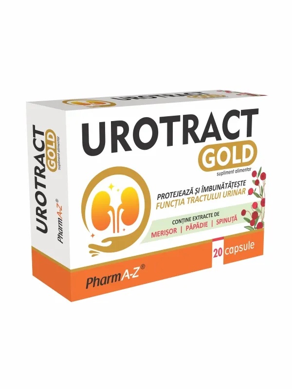 Urotract Gold, 20 capsule, PharmA-Z Ajuta la functionarea optima a sistemului urinar. Ingrediente/capsulă: extract hidroetanolic 100:1 din semințe de Struguri (Vitis vinifera) – 450 mg; extract apos 4:1 din partea aeriana de Splinuță (Solidago virgaurea) – 150 mg; extract hidroetanolic 4:1 din fructe de Merișor (Vaccinium macrocarpon) – 60 mg; extract apos 4:1 din rădacina de Păpădie (Taraxacum officinale) – 10 mg. capsula: gelatină, coloranți: oxid galben de fier și oxid rosu de fier; agent antiaglomerant: săruri de magneziu ale acizilor grași vegetali; Compozitie: VITIS VINIFERA (extract din semințe de struguri) – îmbunătățește funcția renală prin reducerea stresului oxidativ și a leziunilor inflamatorii. SOLIDAGO VIRGAUREA (splinuță) – menține sănătatea vezicii urinare, a tractului urinar și genital VACCINIUM MACROCARPON (extract de merișor) – sursă bogată în vitamina C, cu efect antibacterian și rol benefic în eliminarea pietrelor de la rinichi. TARAXACUM OFFICINALE (extract de păpădie) – stimulează producția de urină, favorizează expulzarea calculilor urinari, potrivită de altfel și în retenția de lichide. Mod de utilizare: Adulți – 1 capsulă pe zi. Prezentare: 20 capsule