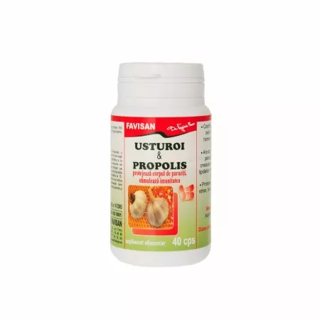 Usturoi si Propolis, 40 capsule, Favisan Contribuie la protejarea corpului de paraziți si la cresterea imunitatii. Contribuie la menținerea sănătatii inimii și homocisteina în limite normale Doza zilnică recomandată: 1 capsulă de 3 ori/zi Ingrediente/capsulă: 1 capsulă (0,4 g) conține: usturoi (Alii sativi bulbus), propolis. Prezentare: 40 capsule