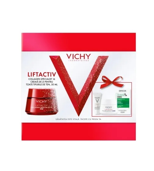 VICHY Trusa Liftactiv Collagen Specialist 16, 50ml, Trusa Xmas 2025 Descriere produs: Vichy Liftactiv Collagen Specialist 16 – Cremă de zi anti-îmbătrânire, cu tehnologie Co-Bonding Crema de zi Liftactiv Collagen Specialist 16 este inovația Laboratoarelor Vichy, bazată pe tehnologia Co-Bonding – o combinație unică de 3 ingrediente active anti-îmbătrânire care acționează sinergic pentru a stimula producția și a fortifica toate tipurile de colagen din piele¹. Formulată pentru toate tipurile de piele, inclusiv cea sensibilă, această cremă pro-colagen corectează 16 semne vizibile ale îmbătrânirii², redând tenului un aspect mai tânăr, neted, luminos și ferm. Textura catifelată se absoarbe rapid, lăsând pielea hidratată, uniformă și tonifiată pe tot parcursul zilei. Cu o formulă hipoalergenică și testată dermatologic, Liftactiv Collagen Specialist 16 este aliatul ideal în rutina zilnică de îngrijire anti-age. ¹Test in vitro asupra ingredientelor. ²Rezultatele testelor clinice, instrumentale și de consumator. Pachetul contine: Liftactiv Collagen Specialist Crema de Zi (50ml) – Această cremă de zi îmbogățită cu peptide anti-îmbătrânire ajută la corectarea semnelor legate de pierderea colagenului pe piele, revitalizând fermitatea și tonusul tenului. Liftactiv Collagen Specialist Crema de Noapte (15ml) – Crema de noapte se concentrează pe repararea și regenerarea pielii pe timpul nopții, diminuând vizibil ridurile și restabilind elasticitatea pielii. Dercos Șampon Tratament Anti-Mătreață (6ml) – Șampon destinat părului normal-gras, care elimină mătreața și calmează scalpul, lăsând părul curat și revigorat. Capital Soleil UV Age Daily SPF 50+ (3ml) – O cremă de protecție solară zilnică cu SPF 50+, esențială pentru protejarea pielii împotriva efectelor dăunătoare ale radiațiilor UVA și UVB, prevenind îmbătrânirea prematură.