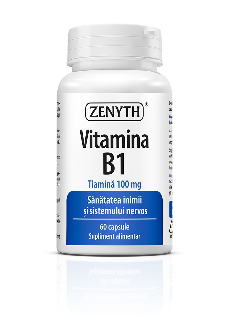 Vitamina B1 Zenyth 60 capsule – Supliment cu Tiamina pentru energie si echilibru nervos Vitamina B1 de la Zenyth este un supliment alimentar esential pentru sustinerea energiei zilnice, a functiei cognitive si a sistemului nervos. Cunoscută si sub denumirea de Tiamina , vitamina B1 este supranumita si „vitamina antistres”, datorita rolului sau in reducerea oboselii si mentinerea echilibrului psihic in perioade solicitante. Vitamina B1 contribuie la transformarea nutrientilor din alimente in energie, la functionarea normala a inimii si la mentinerea unui metabolism energetic eficient. Este recomandata in perioadele de efort intelectual, stres, alimentatie dezechilibrata sau convalescenta. Produsul Zenyth are o formula pura, fara aditivi sintetici, conceputa pentru o absorbtie optima si un efect sustinut asupra vitalitatii si concentrarii. ? Beneficii principale Sustine productia de energie si metabolismul normal al carbohidratilor Contribuie la functionarea optima a sistemului nervos si a inimii Ajuta la reducerea oboselii si a starilor de iritabilitate Imbunatateste memoria, atentia si rezistenta la stres Fortifica sistemul imunitar si sustine echilibrul psihic Promoveaza digestia si absorbtia nutrientilor ? Mod de administrare Adulti: 1 capsula pe zi, administrata in timpul mesei, cu un pahar de apa. Recomandat in cure de 1-3 luni, in special in perioade de efort intelectual, oboseala cronica sau stres. ? Ingrediente active (per capsula) Vitamina B1 (Tiamina) – doza optima zilnica pentru sustinerea energiei si functiei nervoase Alte ingrediente: agenti de incarcare (celuloza vegetala), capsula vegetala (hidroxipropilmetilceluloza). Fara: gluten, lactoza, conservanti, indulcitori, coloranti sau OMG. ? Precautii Suplimentele alimentare nu inlocuiesc o alimentatie variata si echilibrata. A nu se depasi doza zilnica recomandata. A nu se lasa la indemana copiilor. A se pastra in ambalajul original, ferit de caldura si umiditate. ? Prezentare Flacon cu 60 capsule vegetale. Produs in Romania de Zenyth Pharmaceuticals , lider in suplimente naturale de calitate superioara pentru sanatate, energie si echilibru.