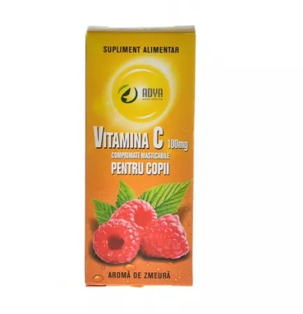 Vitamina C 100mg cu aroma de zmeura pentru copii, 30 comprimate, Adya Green Pharma Vitamina C 100 mg cu aroma de zmeura pentru copii; nu contine zahar sau indulcitori cariogenici. Ingrediente active per comprimat: Acid ascorbic 100 mg. Mod de administrare: Copii intre 3-7 ani – cate 1 comprimat masticabil pe zi, dupa masa de pranz. Copii peste 7 ani – cate 1-2 comprimate masticabile pe zi, dupa mesele principale. Prezentare: 30 comprimate