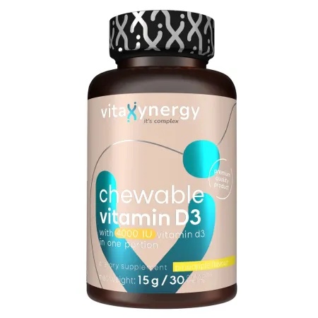Vitamina D3 4000UI, 30 tablete masticabile, VitaXynergy Poate contribui la absorbtia normala a calciului si la mentinerea sanatatii oaselor, poate contribui la functionarea normala a sistemului imunitar, poate contribui la mentinerea functiei normale a muschilor, poate contribui la mentinerea sanatatii dintilor. Tablete masticabile sunt usor de administrat si au un gust placut. Mod de administrare: Copii peste 12 ani si adulti: 1 tableta pe zi in timpul mesei. Ingrediente: Maltodextrină, îndulcitori (xilitol**, sorbitol**), agent de încărcare (celuloză), colecalciferol, agenţi antiaglomeranţi (săruri de magneziu ale acizilor grași, săruri de calciu ale acidului ortofosforic, dioxid de siliciu), aromatizanţi, acid (acid citric). Precautii: Consumul în exces poate cauza un efect laxativ. Produs destinat copiilor peste 12 ani și adulților. Suplimentele alimentare nu înlocuiesc o dietă echilibrată și un stil de viață sănătos. Nu depășiți doza recomandată! A nu se lăsa la îndemâna copiilor. A se consuma inainte de: A se vedea data indicată în câmpul lot/exp. Conditii de pastrare: A se păstra flaconul bine închis, la o temperatură cuprinsă între 5-30 C (41-86oF). A se păstra la loc ferit de surse directe de căldură, umiditate și lumina soarelui. Nu păstrați produsul mai mult de 6 luni de la deschidere. Prezentare: 30 tablete masticabile