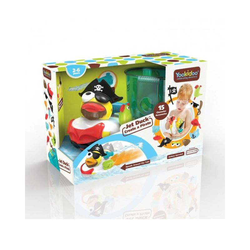 Lasati copilul sa porneasca rata apasand butonul de pornit/oprit aflat pe partea din fata a bazei ratei. Puneti jucaria in cada sau in piscina, pentru a oferi copilului ore intregi de distractie si amuzament.Bateriile nu sunt incluse 4 X 1.5V ‘AAA‘ (LR03).Componente:1 x rata cu motor cu baterii;1 x galetusa de depozitare, cu gauri;1 x agatatoare cu ventuza;15 x accesorii tematice cu pirati;2 x seturi de ochi;2 x ciocuri de rata;2 x labute de rata;1 x palarie;1 x esarfa;1 x steag;1 x sabie;1 x cufar cu comori;1 x haina;1 x camasa;1 x barba;1 x papagal albastru.
