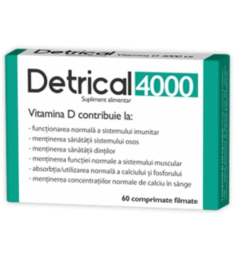 Detrical Vitamina D 4000 UI este un supliment alimentar special creat pentru a ajuta deficitul de vitamina D din corp. Vitamina D3 joaca un rol important in organismul uman, ajutand la functionarea normala a sistemului imunitar, la mentinerea sanatatii sistemului osos. Deficitul de vitamina D3 este corelat cu dezvoltarea anumitor boli si este vazut ca un factor de risc pentru aparitia lor, respectiv boli autoimune, boli metabolice, boli cardiovasculare, hipertensiune, diabet de gradul I, II. Deficitul de vitamina D creste, de asemenea, riscul afectiunilor cu substrat autoimun, adica al acelor afectiuni in care sistemul imunitar se intoarce impotriva celulelor corpului. Mai mult, joaca un rol indispensabil in procesul de mineralizare al oaselor. Deficienta vitaminei D limiteaza absorbtia calciului, chiar si atunci cand dieta noastra furnizeaza cantitati suficiente din acest mineral. Detrical Vitamina D 4000 UI Zdrovit contribuie la : functionarea normala a sistemului imunitar mentinerea sanatatii sistemului osos mentinerea sanatatii dintilor mentinerea functiei normale a sistemului muscular absorbtia/ utilizarea normala a calciului si fosforului mentinerea concentratiilor normale de calciu in sange Mod de administrare Zdrovit Detrical D3 4000IU: 1 comprimat pe zi. Destinat adultilor Mod de prezentare Zdrovit Detrical D3 4000IU: 60 comprimate