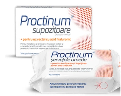 Pachet promotional Proctinum supozitoare + servetele umede cadou Proctinum supozitoare hidratează și protejează mucoasa rectală și pe cea a canalului anal, în condiții care necesită stimularea procesului natural de regenerare și vindecare: Hemoroizi interni și externi Ca tratament adjuvant după chirurgie proctologică și în timpul radioterapiei În caz de inflamație cu senzație de prurit, edem și iritație Rupturi și fisuri anale cauzate de constipație Ingrediente – 10 mg acid hialuronic Acidul hialuronic formează un strat de gel pe suprafața mucoasei ce acționează ca o barieră de protecție creând condițiile optime pentru activarea proceselor naturale de regenerare și apărare imunitară a zonei. Acest film de protecție restabilește umiditatea naturală, reduce inflamația, ușurează și accelerează vindecarea mucoaselor deteriorate din canalul anal și rect. Mod de utilizare Supozitoarele Proctinum sunt destinate exclusiv utilizării rectale. Înainte de utilizare, spălați-vă foarte bine pe mâini. Îndepărtați cu atenție supozitorul din folie. Introduceți delicat supozitorul pe canalul anal. Utilizați un supozitor înainte de culcare, cu excepția cazului în care medicul vă recomandă să procedați altfel. Supozitoarele pot fi utilizate continuu, timp de 5-10 zile consecutive. Dacă este necesar, tratamentul poate fi prelungit până la 20 de zile. Ca tratament unic, supozitoarele nu trebuie utilizate mai mult de 20 de zile consecutive. Prezentare : 10 supozitoare Proctinum servetele umede conțin fibre din material moale impregnate cu o soluție special creată pentru a curăța delicat pielea expusă la factori iritanți, îndepărtând în același timp impuritățile de la suprafață. Curăță și hidratează zona anală exterioară expusă la factori iritanți sau în condiții cauzate de hemoroizi Reduc starea de disconfort întâlnită în boala hemoroidală Au efect emolient Testat dermatologic Hipoalergenic Fără alcool pH fiziologic Ingrediente : scoarța de stejar calmează iritația mușețel ameliorează și tonifică galbenele efect emolient și cicatrizant Mod de utilizare : pentru igiena zilnică, putând fi folosite în locul hârtiei igienice. Doar pentru uz extern. Prezentare: 72 bucăți